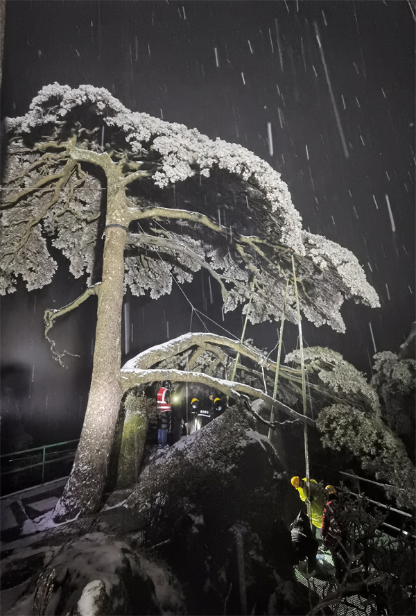 迎客松第四黨支部於28日晚連夜組織綜治、防火、環衛等部門對旅遊公路兩側因積雪垂掛、影響通行的毛竹進行清除,共發動人員84人,共清除毛竹20根。雲穀片區入山口、檢票處、等公共區域門口積雪均已清掃完成。