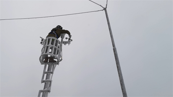 29日上午7時,景區氣象部門工作人員冒著零下五度的嚴寒,爬上7米多高的風向風速杆,對因凍雨結冰的儀器進行除冰,確保黃山氣象數據精准。