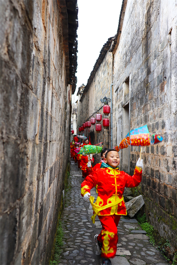 2月4日,雖然寒風陣陣,但是在皖南黟縣宏村古村落卻熱鬧非常。由村民和遊客組成的花燈表演隊正走街串巷,為人們送上新春祝福。返鄉的大學生敲著鑼鼓,幼稚園的娃娃們舉著魚燈、鼠燈等各式各樣彩燈,遊客參與其中……熱鬧的民俗表演吸引了更多的人跟著巡遊,大家紛紛拿起手機記錄這開心熱鬧的一刻。