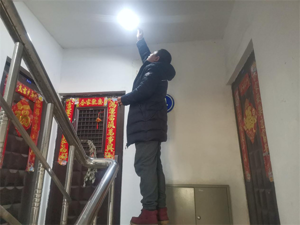 府興雅園小區是金谷社區的一個老舊小區,樓道燈逐漸老化損壞,經常得不到及時修理,給居民出行帶來諸多不便。金谷社區書記歷戰宏得知情況後,在「金谷滿倉」資源儲備庫微信群中發佈了任務,尋求資源支持。消息一經發出,旭輝永升紅色物業團隊在第一時間就認領了任務,自願出資為小區捐贈了聲控燈泡、燈座等物資;擁有電工資質的社區志願者們也紛紛響應,主動參與安裝。在社區網格員的帶領下,先後對府興雅園小區樓道照明線路進行逐一檢測和維修,共計解決了2棟樓、130餘戶的照明問題,用實際行動為居民點亮了暖心回家路。