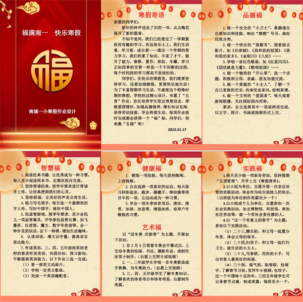 南城一小立足「五育融合」,為孩子們精心設計了「福滿南一 快樂假期」的「五福」作業。品德福,旨在培養愛國情懷,加強品德修養;智慧福,旨在啟迪學生智慧,提升探索能力;健康福,旨在堅持體育鍛煉,強健身體素質;藝術福,旨在提高鑑賞能力,用美修養身心;實踐福,旨在樂享實踐活動,學會熱愛生活。