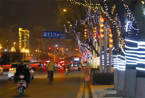 行走在馬路上,只見大街小巷掛上了喜慶的燈籠、彩燈,到處呈現一派喜氣洋洋的節日氛圍。行道樹上高高掛起的大紅燈籠、一串串隨風擺動的小紅燈籠,還有五顏六色的彩燈籠、彩燈飾,真是鮮艷奪目、格外喜慶,將街道裝扮得無比靚麗。放眼望去,濃郁的年味瀰漫在大街小巷,漫步其中的市民無不深切感受到了新春的氣息。
