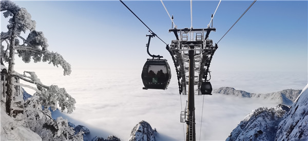 踏上旅途,驚喜不斷,來往的索道車廂好似在仙境中穿梭,將一批又一批的遊客送至這冬日的黃山。恰逢雪後初霽,延綿起伏山峰都沐浴著陽光,潔白的山脈也染上了金燦燦的顏色,奪目、溫暖。