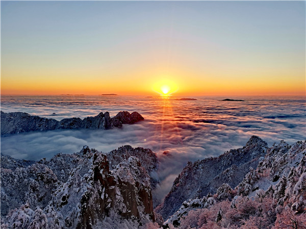 經過嚴冬的洗禮,黃山的冬景如同大自然的饋贈一般降臨人間。它壯觀,百里黃山、百里煙雲,雪的足跡遍佈千峰萬壑;它浩瀚,雲海翻騰,大氣磅礴,在山峰間不斷流淌延綿;它夢幻,玉樹瓊枝,琉璃世界,猶如天上的仙境珊瑚島。