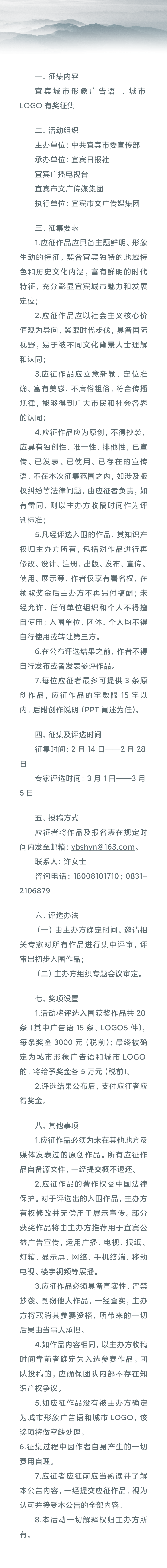 日前,記者從宜賓市委宣傳部獲悉,由中共宜賓市委宣傳部主辦,宜賓日報社、宜賓廣播電視台、宜賓市文廣傳媒集團承辦的宜賓城市形象廣告語 、城市LOGO有獎徵集正式啟動。