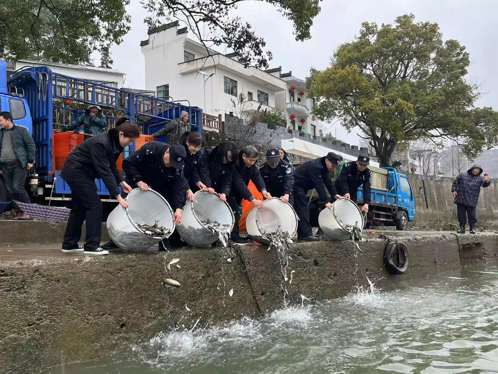 2月17日,安徽歙縣人民法院會同歙縣公安局、歙縣人民檢察院、歙縣農業農村局在城區和新安江沿線4個投放點共同開展“保護新安江 魚你同行”增殖放流活動,共計投放魚苗10萬尾。此次增殖放流魚苗活動,購買魚苗所需的9萬元費用,系公安機關偵破的6名非法捕撈水產品犯罪分子繳納的生態修復補償金。參加增殖放流的公檢法幹警和漁政執法人員,冒著雨雪和低溫天氣,用實際行動傳遞生態環境保護理念,呼籲全社會和廣大群眾共同守護一江碧水,為建設生態型國際化世界級休閒度假旅遊目的地城市貢獻力量。