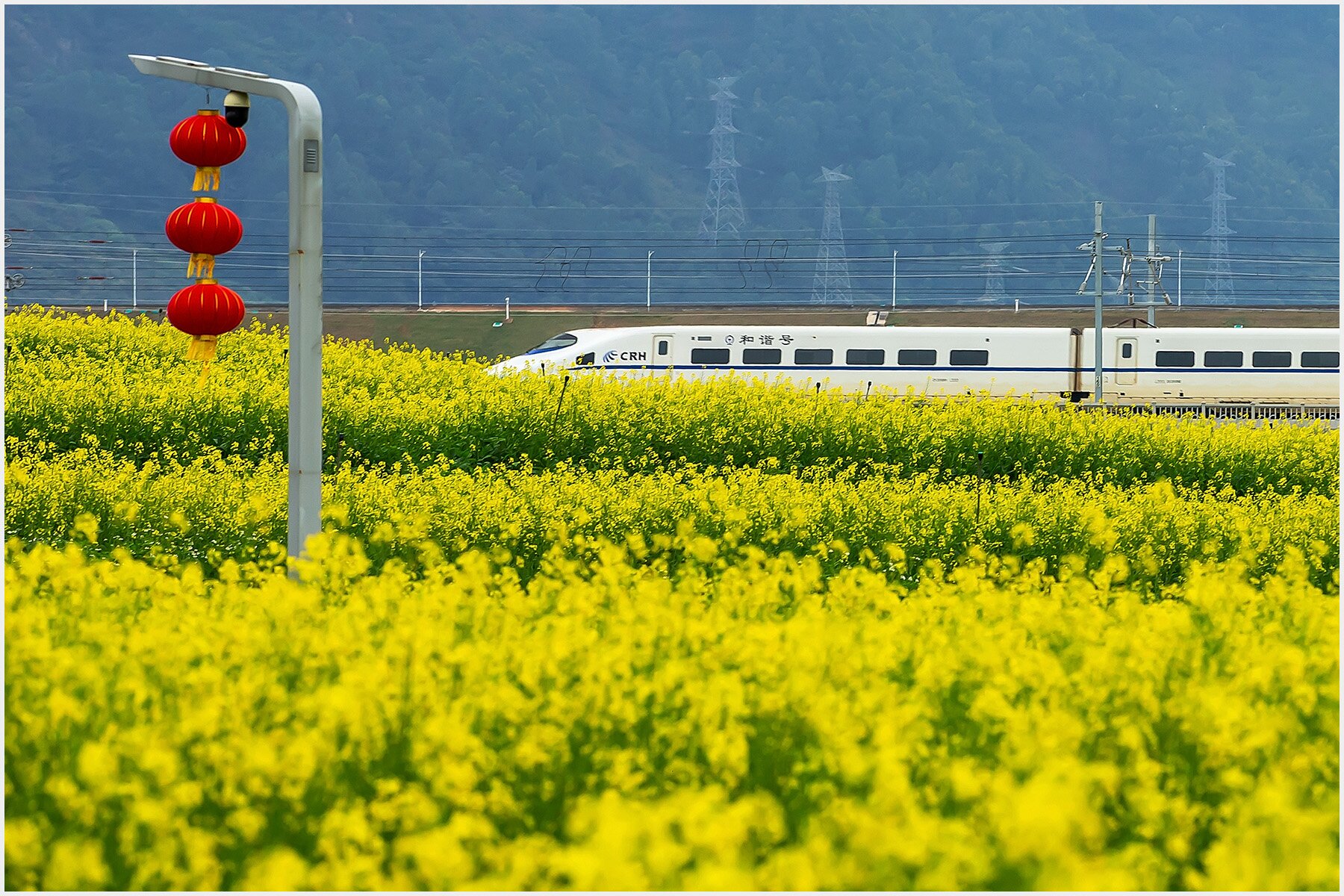 油菜花田的上空,偶爾會有高鐵飛馳而過,像是「開往春天的列車」,充滿生機與希望。整個花期將持續到2月底,市民朋友可以趁着大好的春光,邀上三五好友,一起出去賞花、遊玩,擁抱爛漫的春天! (記者 黃鳳鳴 通訊員 朱春艷 供圖 光明歡樂田園公司 歐陽勇)