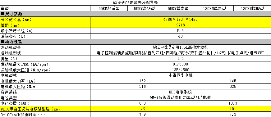 據了解,驅逐艦05長4780mm,寬1837mm,高1495mm,軸距2718mm,車身尺寸在同級中優勢明顯,同時採用海洋美學設計理念打造,集年輕科技、精緻高級於一身,外觀潮流動感,內飾多元配色組合高級新穎,充滿新能源屬性。動力系統方面,驅逐艦05採用廣受市場認可的DM-i超級混動技術,由驍雲-插混專用1.5L高效發動機、EHS電混系統、DM-i超級混動專用功率型刀片電池核心零部件組成,並提供46KM及101KM兩種純電續航里程(WLTC工況)。