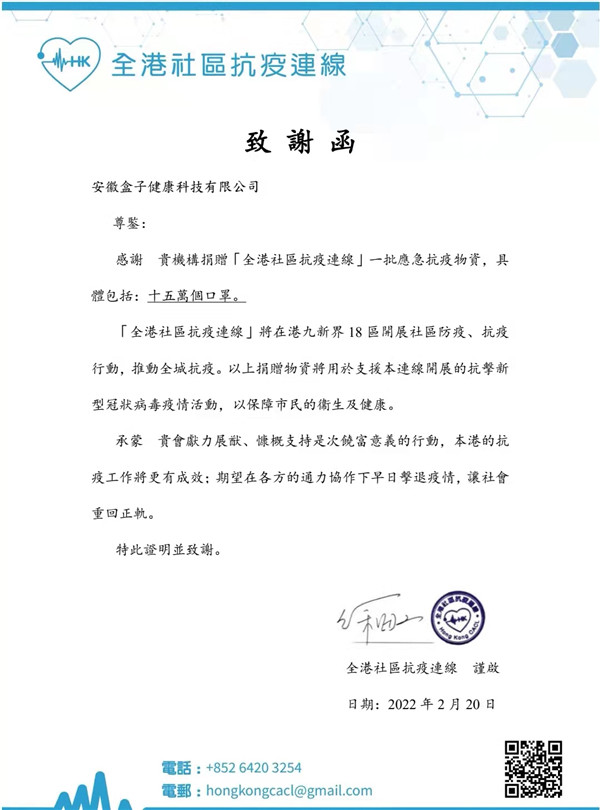 據悉,此批抗疫物資由“全港社區抗疫連線”代表接收。“全港社區抗疫連線”為此專門發來感謝信表示,“全港社區抗疫連線”會將此批物資用於全港抗擊新冠疫情活動,支持香港市民全力抗疫,確保市民的衛生健康。