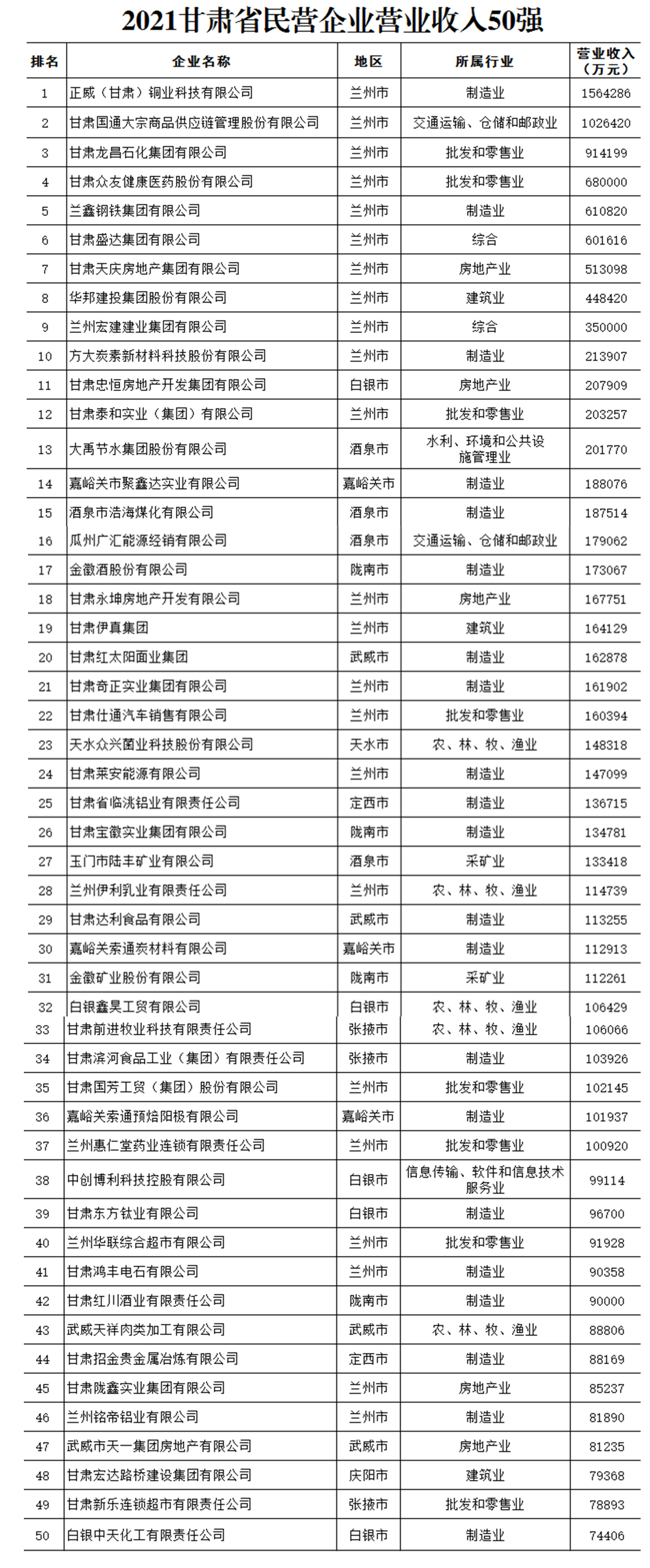 記者了解到,2020年甘肅省民營企業50強入圍門檻為7.44億元,較上年提高0.78億元,有2家企業營業收入超過100億元,有11家企業營業收入超過20億元,10億元到20億元的有24家,比上年增加6家。其中,正威(甘肅)銅業科技有限公司156.42億元,甘肅國通大宗商品供應鏈管理股份有限公司102.64億元,甘肅龍昌石化集團有限公司91.42億元,甘肅眾友健康醫藥股份有限公司68億元,蘭鑫鋼鐵集團有限公司61.08億元位列前五位。