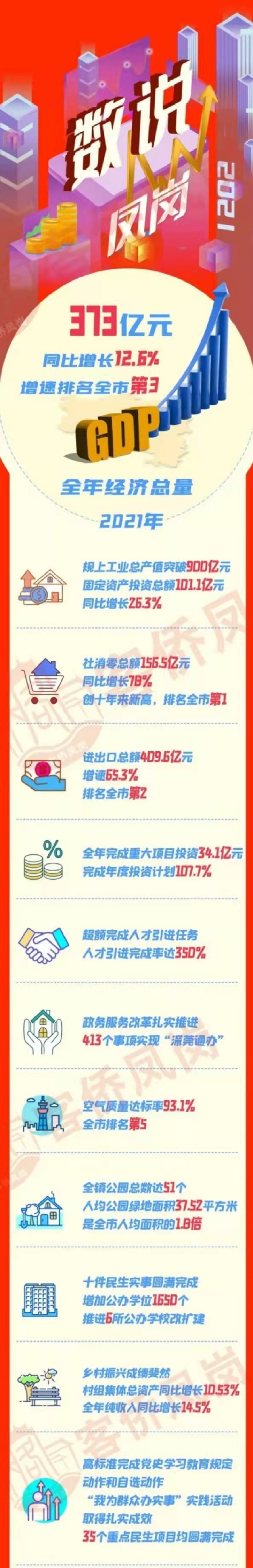 去年,鳳崗深入實施創新驅動發展戰略,經濟高質量發展取得新進展;努力把握「雙區」建設機遇,改革攻堅取得新突破;積極提升城市綜合環境,城市品質邁上新台階;持續增進民生福祉,公共事業取得新進步;穩妥應對各項風險挑戰,社會治理水平取得新提升;紮實開展黨史學習教育,全面從嚴治黨取得新成效。