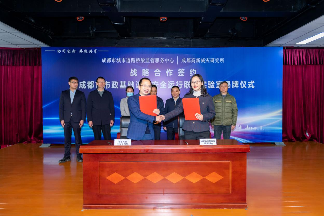 3月1日,成都市城管委道橋監管中心與成都高新減災研究所簽署了戰略合作協議,成都市首個市政基礎設施安全運行聯合實驗室正式揭牌成立。