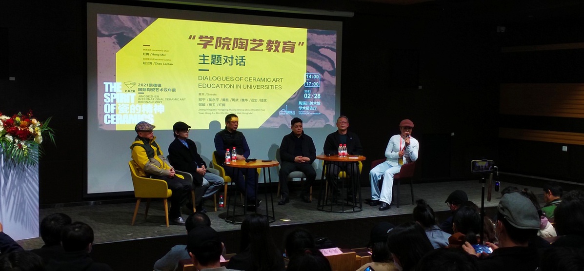 “瓷的精神”2022景德鎮國際陶藝雙年展系列學術活動之“學院陶藝教育”主題對話2月28日下午在景德鎮陶溪川美術館學術報告廳舉行。黃勝、陸斌、魏華、吳永平、遠宏、楊衞、郅敏、鄭寧、周武等知名艺术家出席活動。