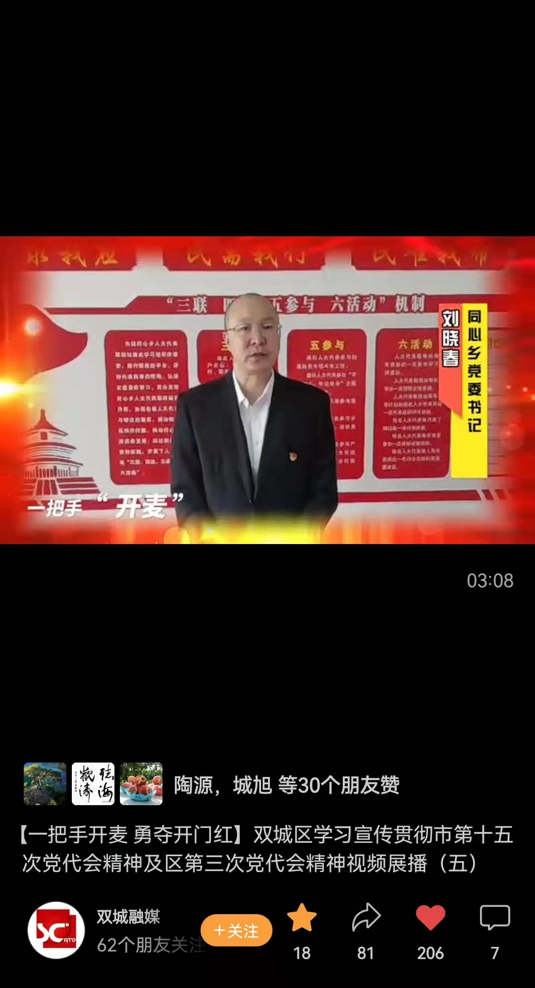 三是創新抓宣傳,拓展知曉率。以學習宣傳貫徹市黨代會精神為重點,通過各類公共場所LED屏、樓宇電視、廣告板(牌)等載體進行社會宣傳,營造濃厚的社會氛圍。在雙城電視台和雙城發佈微信公眾號,開闢《黨代表心聲》《一把手開麥 勇奪開門紅》兩個專欄,通過《黨代表心聲》專欄,由雙城區參加市黨代會的代表現身說法,以他們的親歷感受幫助全區黨員幹部加深對市黨代會精神的理解和把握;通過《一把手開麥 勇奪開門紅》專欄,由全區各部門一把手開麥上鏡發聲,立足本單位、本部門實際,談如何創新工作、推進黨代會精神落實落靠,現已推出7期。