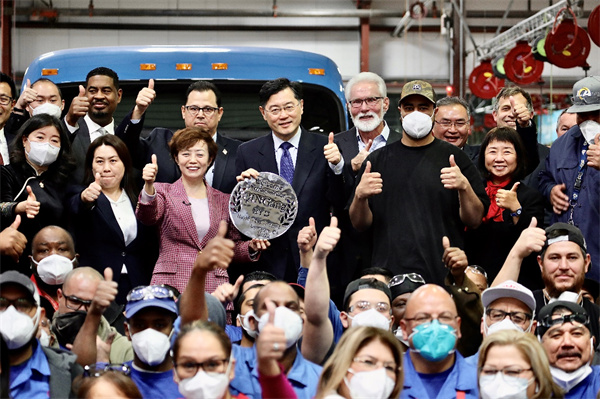 洛杉矶时间2022年3月1日,中国驻美大使秦刚到访比亚迪位于加州兰卡斯特市的纯电动大巴工厂。中国驻洛杉矶总领事张平、兰卡斯特市长Rex Parris,以及比亚迪股份有限公司执行副总裁兼比亚迪美洲分公司总裁李柯参加会见。