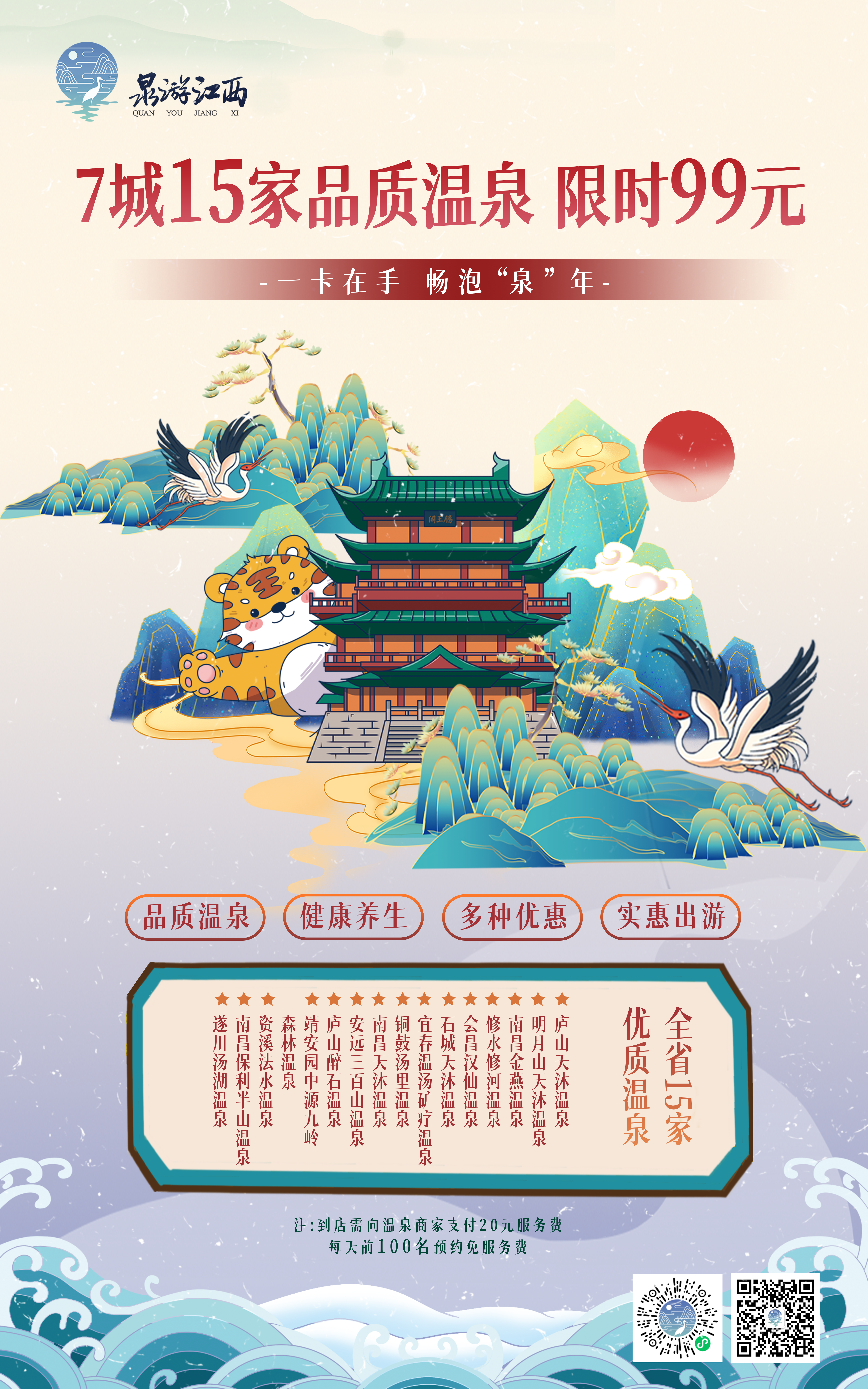 消費者通過登錄「雲遊江西」「泉游江西」微信公眾號、小程序均可以99元/人購買江西溫泉一卡通。購卡激活後,用戶除了可享受以上15家溫泉每家各一次的免溫泉門票消費外,還可專享多類消費項目的特殊優惠,通過「泉游江西」小程序預約,每日前100名用戶還可享受免收服務費的福利。此外,每周「泉游江西」小程序及公眾號還將推出溫泉酒店優惠券等各種溫泉福利優惠抽獎活動。