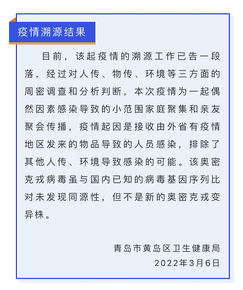 3月6日,青島市黃島區衛生健康局發布公告稱,目前,黃島區此次疫情的溯源工作已告一段落,經過對人傳、物傳、環境等三方面的周密調查和分析判斷,此次疫情為一起偶然因素感染導致的小範圍家庭聚集和親友聚會傳播,疫情起因是接收由外省有疫情地區發來的物品導致的人員感染,排除了其他人傳、物傳、環境導致感染的可能。該奧密克戎病毒雖與國內已知的病毒基因序列比對未發現同源性,但不是新的奧密克戎變異株。