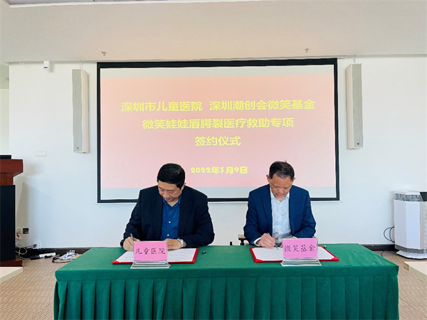 捐贈儀式上,深圳潮創會微笑基金、深圳市兒童醫院領導簽署了「微笑娃娃」唇齶裂醫療救助專項合作協議。深圳潮創會微笑基金將出資100萬元,為在深圳市兒童醫院就診、患唇齶裂的困難家庭,提供治療手術的支持費用。(記者 林麗青)