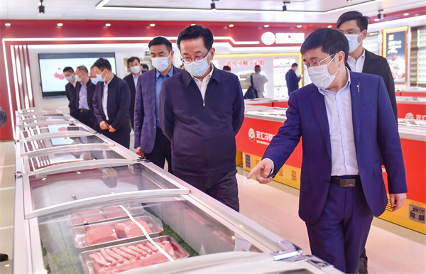 陽春三月,沙澧大地萬木蔥蘢,生機勃發。盧雍政一行來到雙匯第一工業園,參觀雙匯集團現代化的生豬屠宰、分割、肉製品生產線。整齊乾淨的生豬屠宰車間、高溫肉製品生產車間,自動流水生產線有序轉動,員工們熟練認真地操作,琳琅滿目的產品陳列。盧雍政邊看邊聽企業負責人介紹情況,詳細了解各道生產工序流程和銷售情況。
