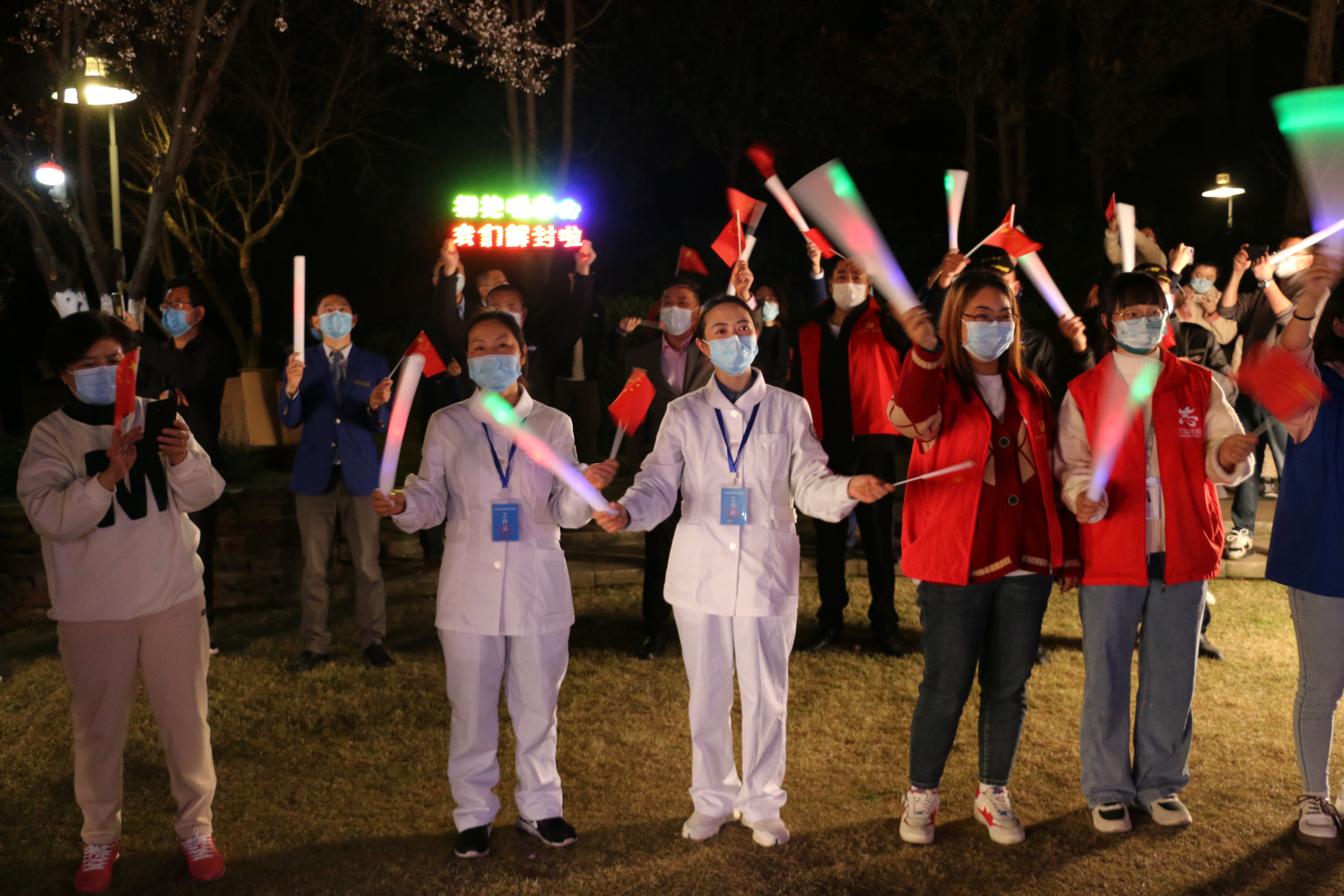 「我和我的祖國,一刻也不能分割,無論我走到哪裏,都流出一首讚歌……」「時間的手撫過了臉頰,他們誰都沉默不說話;我希望許過的願望一路生花,護送那時的夢抵擋過風沙……」「你在我生命中,太多的感動,聽我說謝謝你,因為有你,溫暖了四季……」凌晨零時的封控樓棟下,一首又一首的歌聲輕輕迴蕩,陸續走出的居民安靜而喜悅。地面的熒光棒拼成的「平安」二字閃耀亮起,燈光牌上的「我們解封啦」「感謝一麓有你」,雖無言,抵萬語。