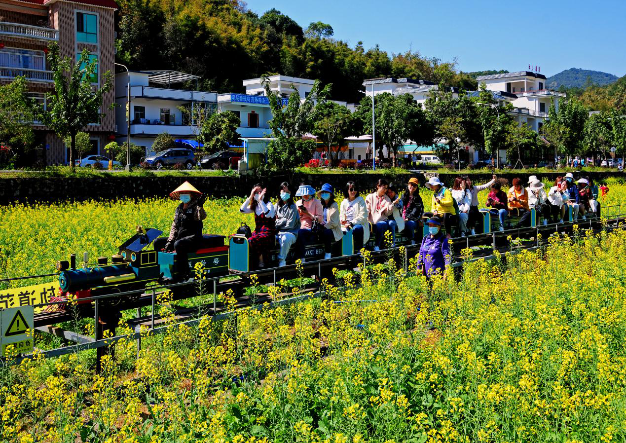 初春時節,走進廣州花都區梯面鎮紅山村,觸目所及盡芳菲。坐上開往春天的小火車,行進在金黃的油菜花海里,讓人愜意滿懷。當下,山村數十畝油菜花田金黃一片,朵朵菜花迎春怒放,惹來蜂飛蝶舞和大批遊客聞訊而至,踏青打卡。