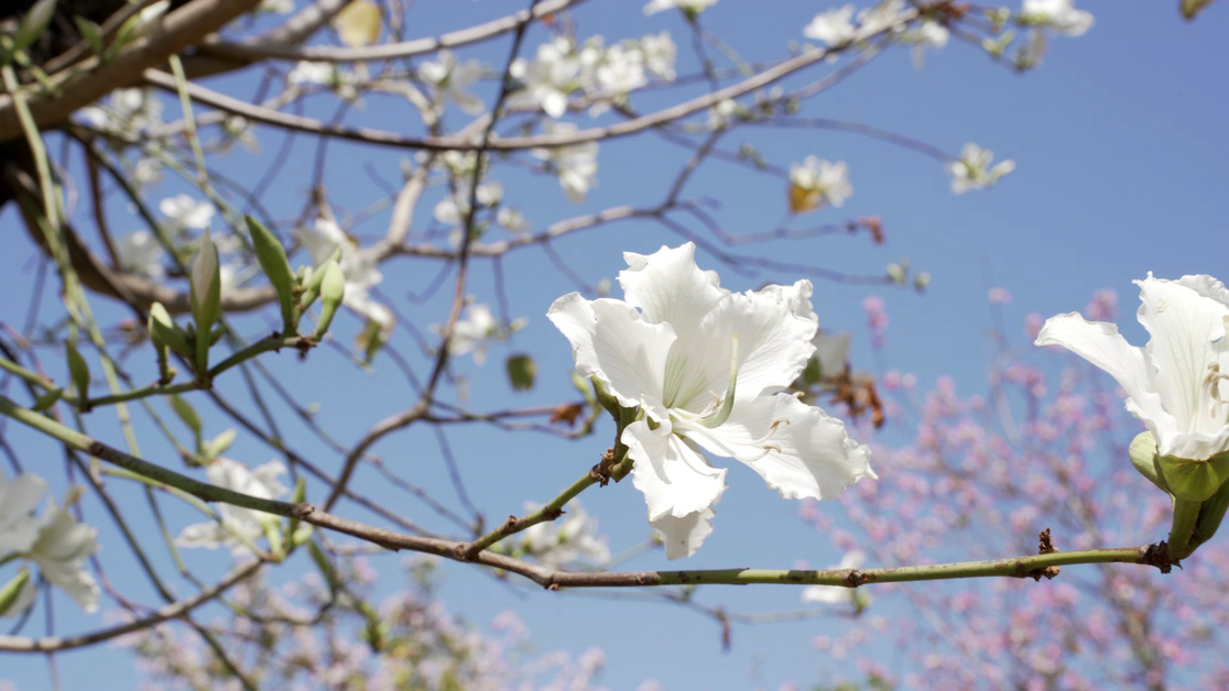 北起鳳凰路南至迎賓橋,花都湖兩岸連綿10公里的宮粉紫荊正燦爛盛放。粉紅、雪白、紫紅的宮粉紫荊星星點點掛在枝頭,遠遠看去,紫雲滿天、浪漫滿城。宮粉紫荊又名洋紫荊,是一種豆目、豆科落葉喬木。每年3月份左右是宮粉紫荊的花期,連綿成片的粉色花帶,景色十分唯美浪漫,吸引了不少市民朋友拍照打卡。