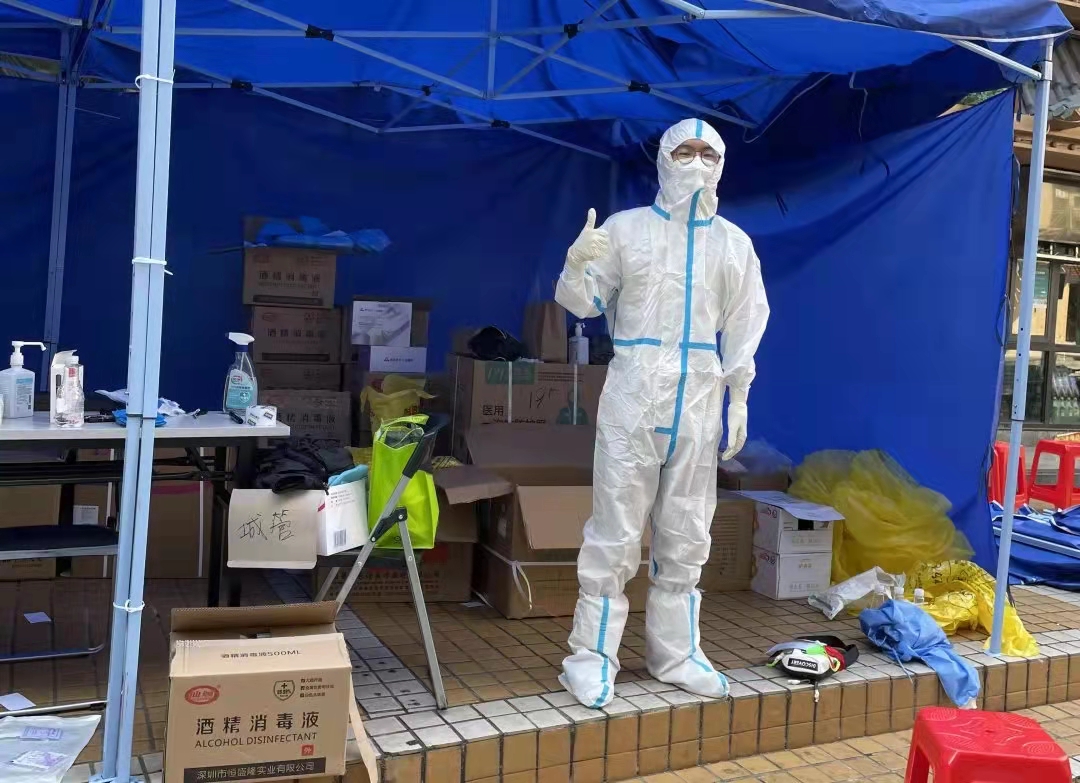 該司大鵬高壓線落地項目的譚壽梁,從3月9日開始進駐深圳福田區新洲中心村,他在這個「最危急的地方」脫產抗疫已經整整8天。協助醫護人員配備核酸物資,進行核酸樣管的收集統計,協助醫護人員處理醫廢,對志願者提供物資保障,對居民進行物資配送,給困難群眾配送應急、生鮮包,清理居民生活垃圾……這是他一天的工作清單。腰酸了,腳麻了,他沒有在意,匆匆吃過飯轉身又投入到緊張的工作中。