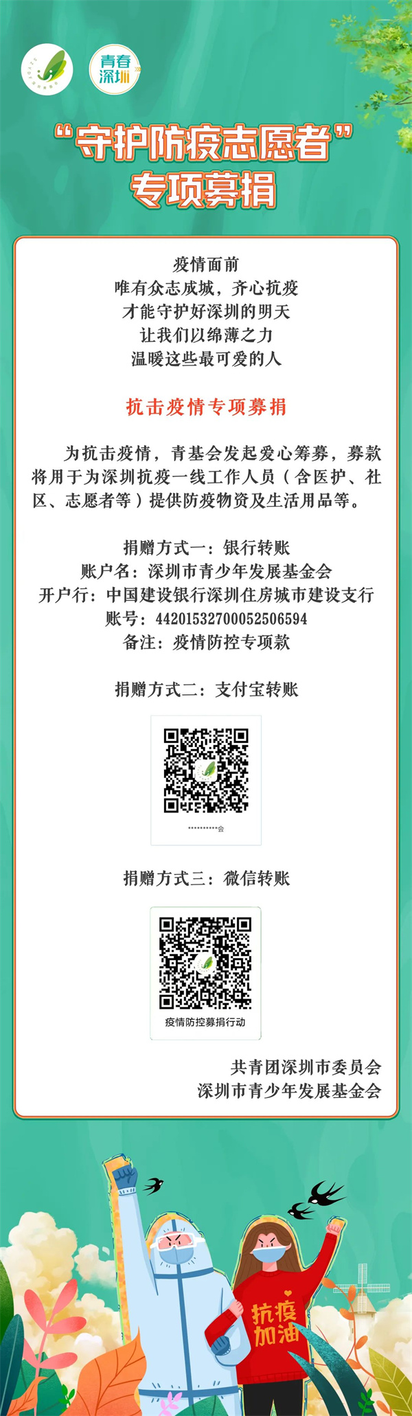 深圳共青團呼籲社會各界愛心企業、人士為深圳疫情防控共伸援助之手,匯聚磅礴大愛。讓我們用真情與真愛共築愛心鵬城,用熱情與希望共克時艱。(記者 易小婧 通訊員 青春深圳)