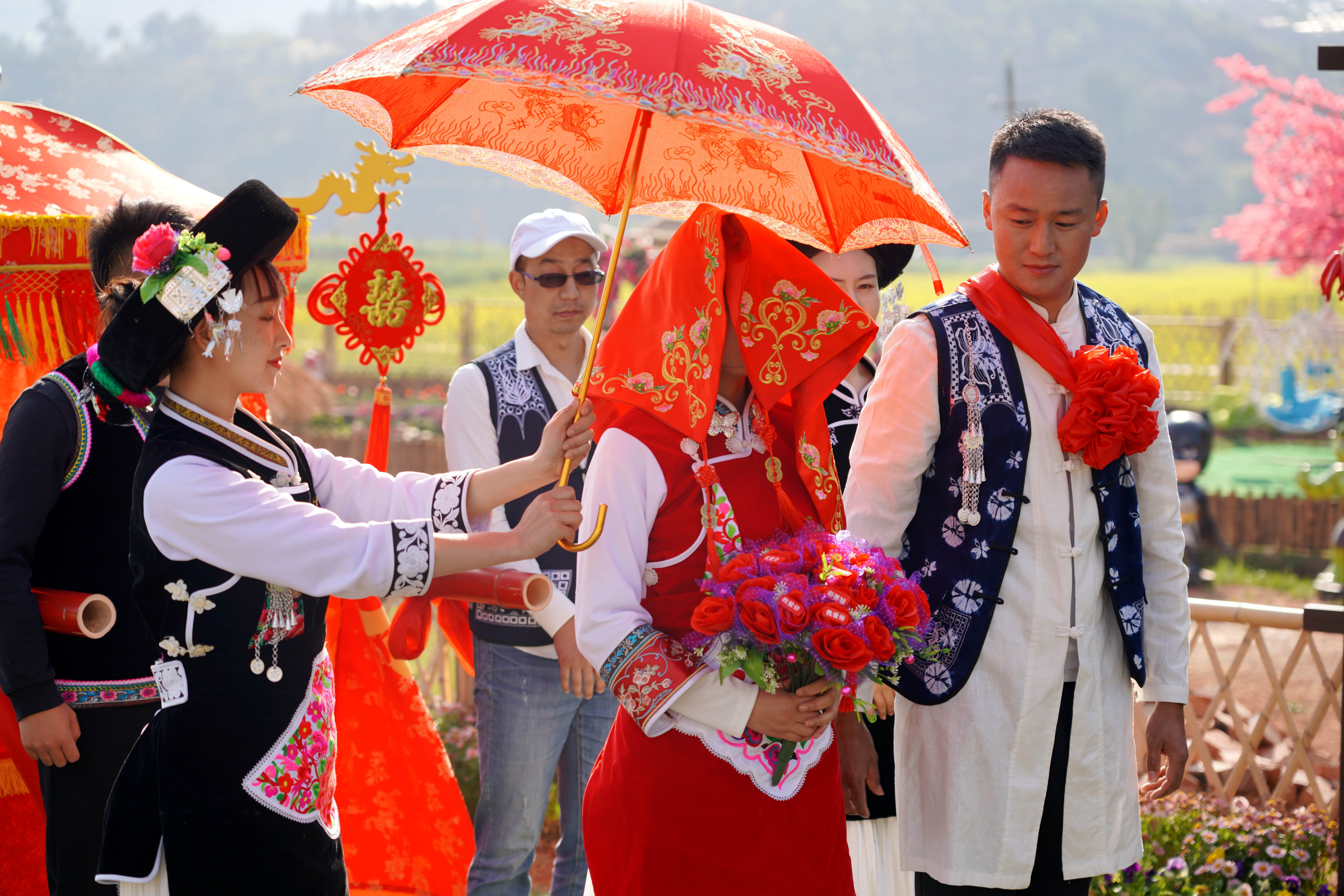 最有趣的,要數傳統白族婚禮展演。婚禮喇叭響起,首先映入眼帘的是4面旗子,2面綠旗、2面紅旗,喜事有紅有綠,寓意着美好結合。新娘坐在轎中,新郎騎着馬跟在轎子後面,在嗩吶聲中接受眾人祝福。原汁原味的傳統白族婚禮,展示了雨露的特色民俗文化。