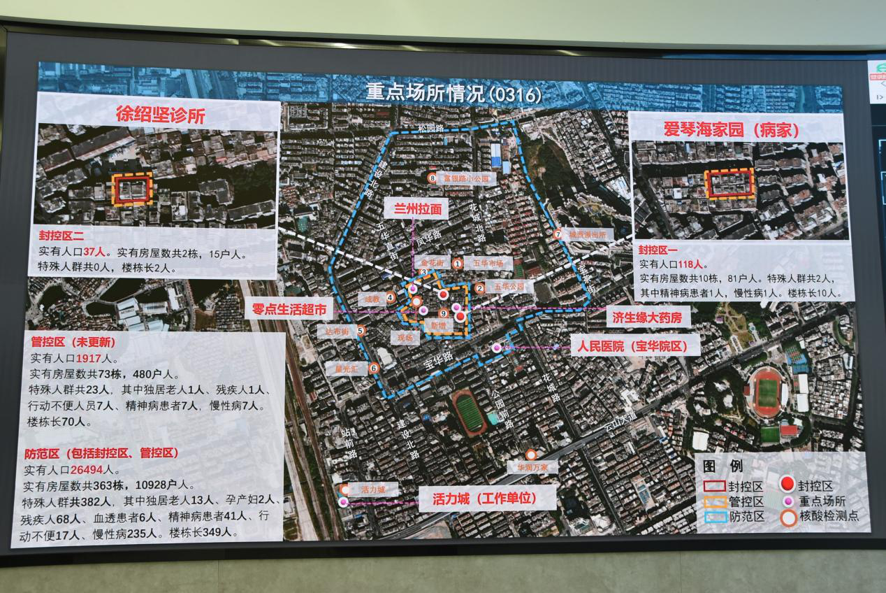 在近期五華村疫情處置過程中,花都區應急指揮中心接到通知馬上設置會場,迅速調取現場地圖和衛星圖片並進行打點標記。指揮中心主任梁波介紹:別小看這張圖標,這是相關部門通力協助,精準標識出來的。上面清晰地標註了封控區、管控區、防範區等各區域範圍內的樓棟數、戶數、人數,其中特殊群體有哪些,這些數據、位置等信息都可以為指揮部科學決策提供有力的支撐。(記者 賴小青 通訊員 花宣 李朝暉 陳琳)