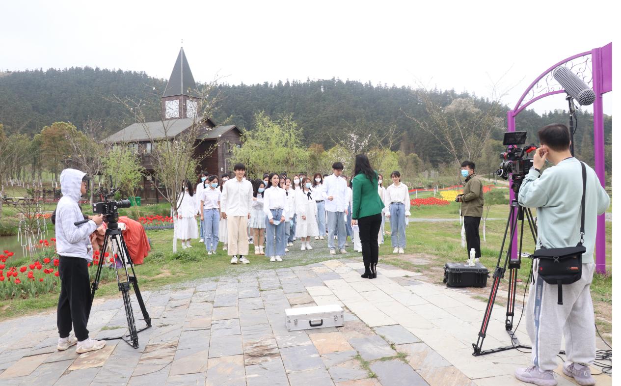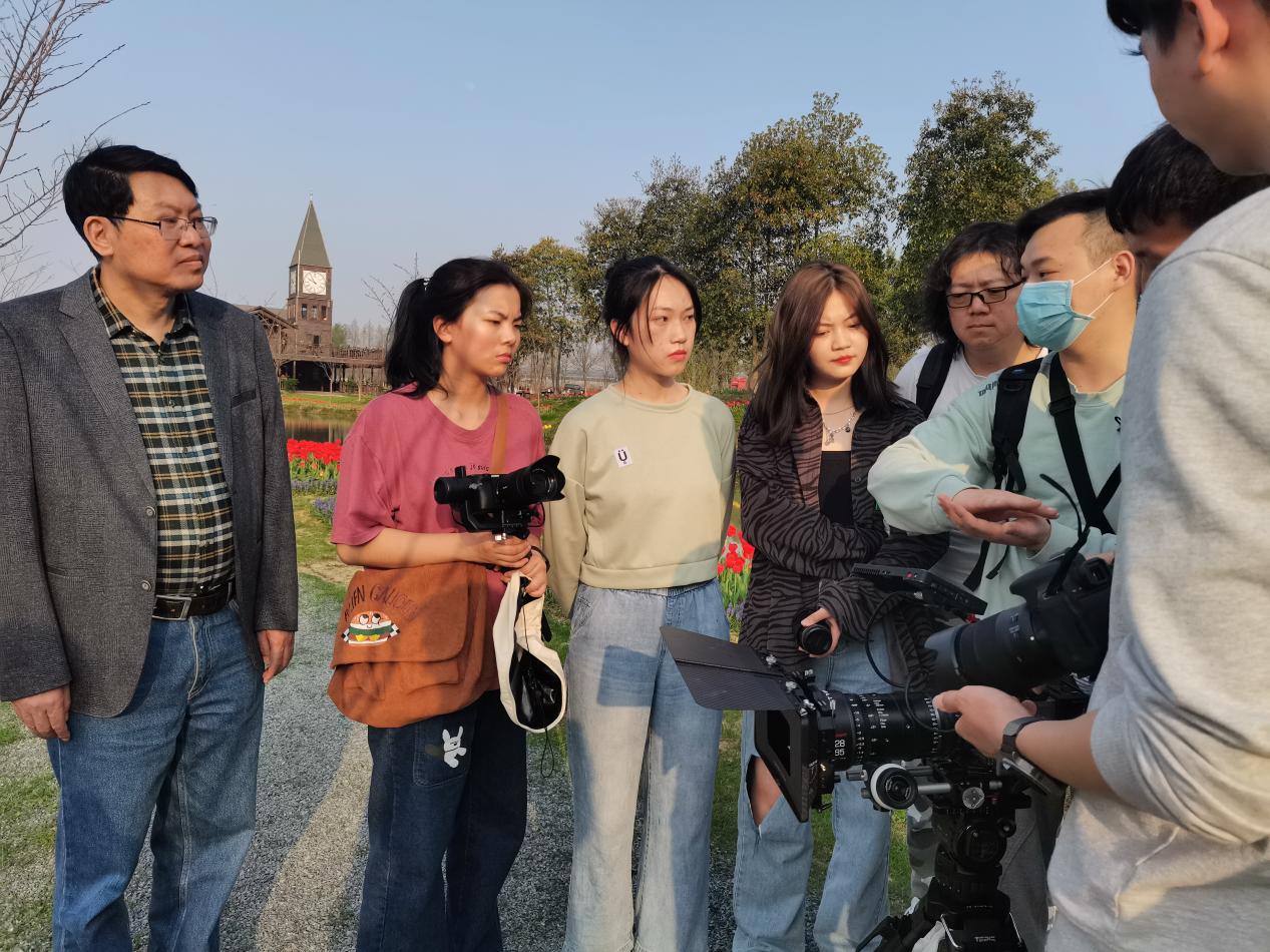 老師和學生們走出教室,把校園地標——先鋒小鎮作為技能培訓現場,將櫻花大道以及學生勞動場所當教室,開展新聞采寫、導演拍攝、直播變現及創意設計等短視頻宣傳項目實踐活動。