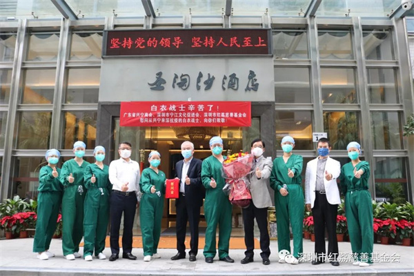 為了表示誠摯慰問和衷心感謝, 3月20日上午,廣東省興寧商會會長黃雅敏、深圳市寧江文化促進會會長黃鏡芳、深圳市紅荔慈善基金會理事長曾雲樞、執行理事長鄧紹光一行,特地來到興寧市支援深圳抗疫核酸採樣隊在深圳的駐地,向每一位醫護隊員送去了3000元慰問金,共計18萬元。