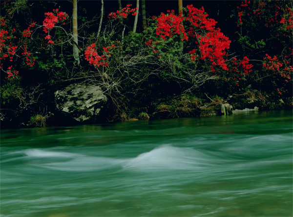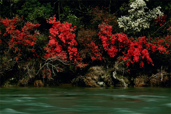 3月27日,在新安江源頭安徽黃山市休寧縣流口地區沿河拍攝的杜鵑花。人間三月芳菲盡,黃山杜鵑始盛開。如今在休寧的新安源頭、五龍山脈、沂源河畔等區域次第綻放,紅豔熱鬧,美不勝收。