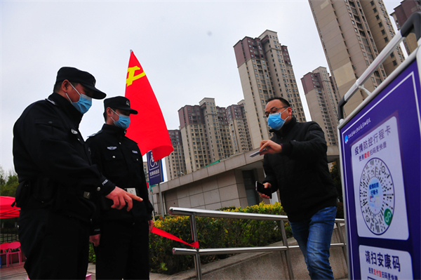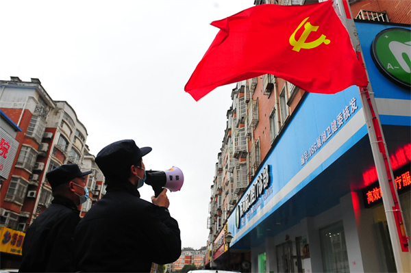 抗疫工作還在繼續。抗疫一線,黨旗獵獵,黨徽警徽閃耀,全體公安人的口號是:「疫情不退我不退。」(楊祖友 龔舒斌)