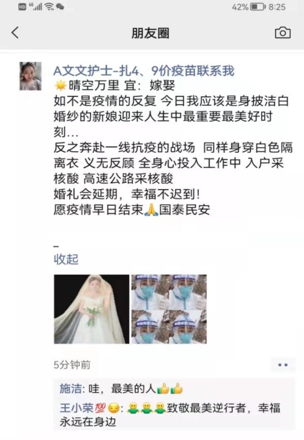 護士李詩文本應該3月26日結婚,因為疫情防控任務重,人員緊張,她主動推遲了婚禮。她在朋友圈裏寫道:「如不是疫情的反覆,今天我應該是身披潔白婚紗的新娘,迎來人生中最重要最美好的時刻,可我卻奔赴一線抗疫的戰場,身穿白色防護服,義無反顧全身心地投入到工作中。婚禮會延期,幸福不遲到!願疫情在日結束,國泰民安!」同事們都很感動,紛紛為她點讚,發出祝福!