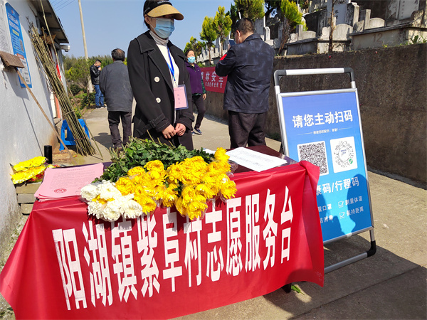 記者瞭解到,在全區各個重點祭祀場所都搭設鮮花兌換臺,鎮村幹部、志願者們都會向陸續前來的祭掃群眾普及鮮花祭祀、網上祭祀等文明祭祀新風尚,以綠色文明的方式追憶逝者、寄託哀思。“我們村共有三個祭祀點,我們在每個點都準備了鮮花,用於紙幣和塑膠花等殯葬用品,進一步提升村民文明祭祀的意識,也讓大家過一個安全的清明節。”陽湖鎮三充村黨支部書記鄭新蓉。