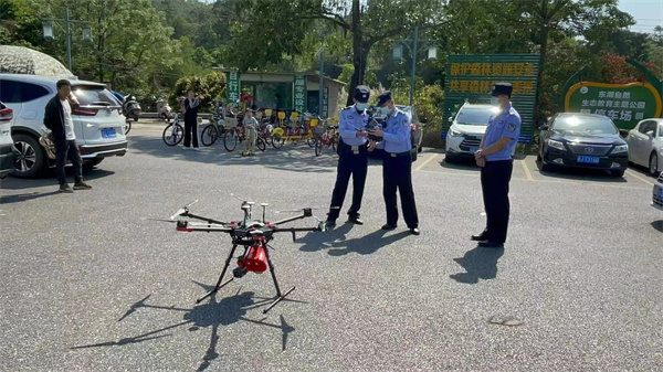 陽春市公安局森林警察大隊民警利用無人機開展清明防火宣傳。(攝影:周立平)