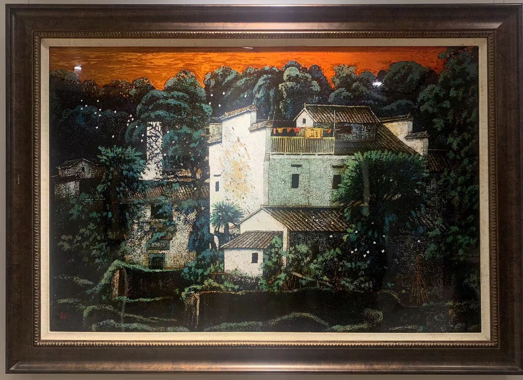 漆畫作品《霞落鳥歸》運用了古法髹漆技藝,採用天然純大漆、漆粉、色漆與蛋殼塑造了一幅恬淡安逸的徽州人家的幸福生活,天邊的晚霞、靜靜歸巢的鳥兒和大片的波浪似的林蔭樹木無不吸引著觀者的情思。