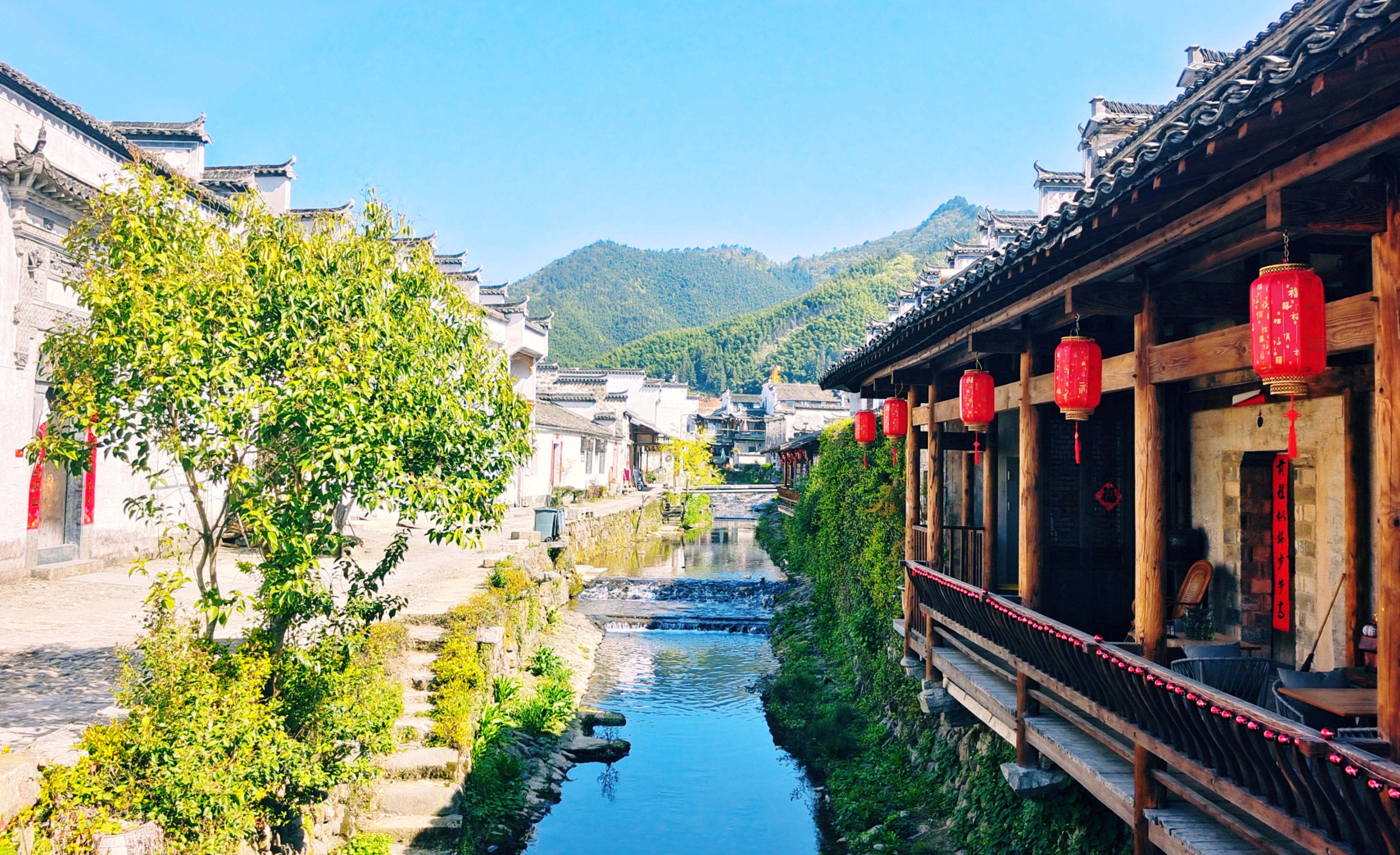 過駟車橋,溪邊木欄涼亭,可納涼觀景,碧水淙淙中游動著成群的小河魚,村口有一株烏桕樹,與對面幾株垂柳相應,一副烏桕綠柳伴溪上,金階駟橋通雕樓的畫卷緩緩展開。苔痕上階綠,草色入簾青,踏著青石板路,沿前街溪而上,兩側是隨勢建起的徽派民居,老屋的牆上和欄杆上,都是歲月留下的痕跡。