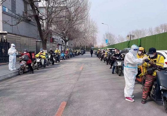 外賣騎手是生活物資保供的重要力量,為防止因流動產生疫情隱患,瀋河區市場監管局在北通天街和泉園廣場設置兩處檢測點,對騎手們每日有序進行核酸檢測。同時,持續加強對外賣騎手站點的檢查,店外約談負責人,從騎手聚集性管理、騎手健康管理、站點防疫管理、外賣配送管理等方面逐項明確要求,確保站點及配送員嚴格落實各項防控規定。