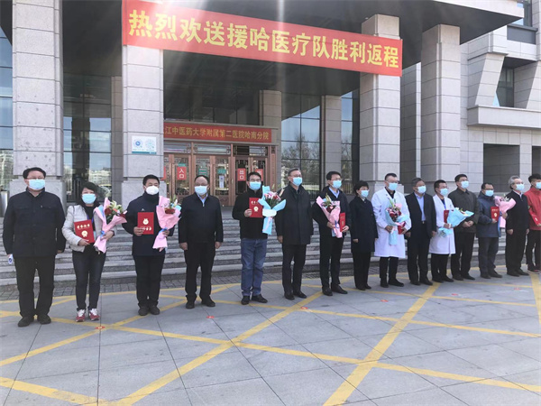 歡送現場,領導們為援哈醫療隊隊員代表頒發榮譽證書;為援哈醫療隊頒發錦旗。儀式結束後,大慶油田總醫院開登車返程。歡送援哈醫。