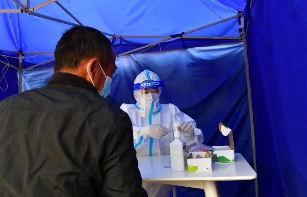 此時,他的愛人余泓揚正化身「大白」,在醫院新冠病毒抗原檢測處,忙着為患者和家屬等進行抗原檢測。