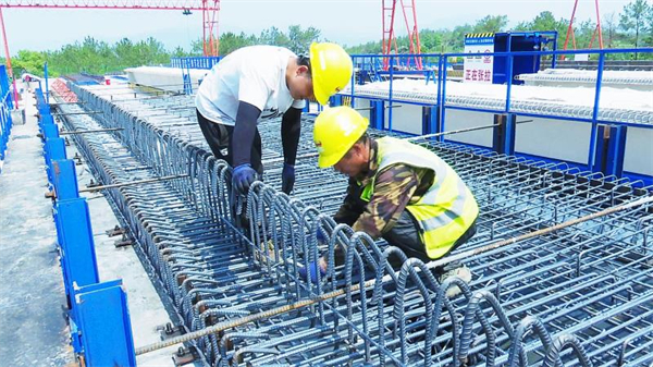 近日,記者走進雄信高速預製梁鋼筋加工廠,處處機聲隆隆,運輸車輛往來穿梭。現場,工人們忙着焊接鋼筋。在預製箱梁模板上,工人們嚴格按照設計要求和施工規範,進行鋼筋綁紮等工作,保證預製箱梁澆築成功。