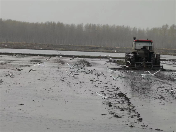 4月21日,記者在肇源農場有限公司「一畝田」基地看到整地機車在寬闊的稻田內作業,數隻江鷗在機車周圍環繞,不遠處已經平整過的稻池水面上停留着數百隻江鷗,一幅幅和諧美好的稻田風景圖在北大荒集團綏化分公司肇源農場有限公司的水稻田中再現。