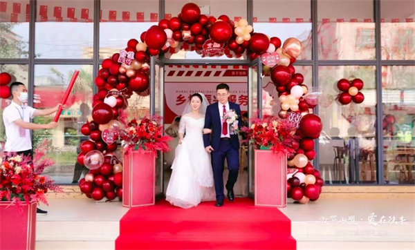 「愛情不在婚姻的形式,而在彼此真誠與行動。愛情不是轟轟烈烈,而是細水長流。抵制高價聘金聘禮,引導婚事簡辦風尚。崇尚文明新風,追求幸福生活……」新人們宣讀結婚誓詞、交換結婚戒指、點燃愛情聖火、喝交杯喜酒、贈送手捧花……整場婚禮儀式持續了不到30分鐘。