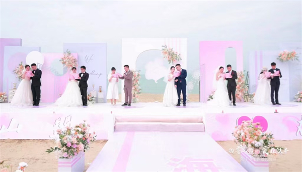 伴隨着悠揚的樂曲,在一片金黃的沙灘上,身着新婚禮服的6對新人牽手同行,步入面朝大海的婚禮現場,在親朋好友的見證下翻開人生的新篇章。他們當中既有在基層一線工作的年輕幹部,也有長期耕耘在三尺講台上的辛勤園丁;既有來自不同企業的優秀員工,也有機關團體的優秀青年。