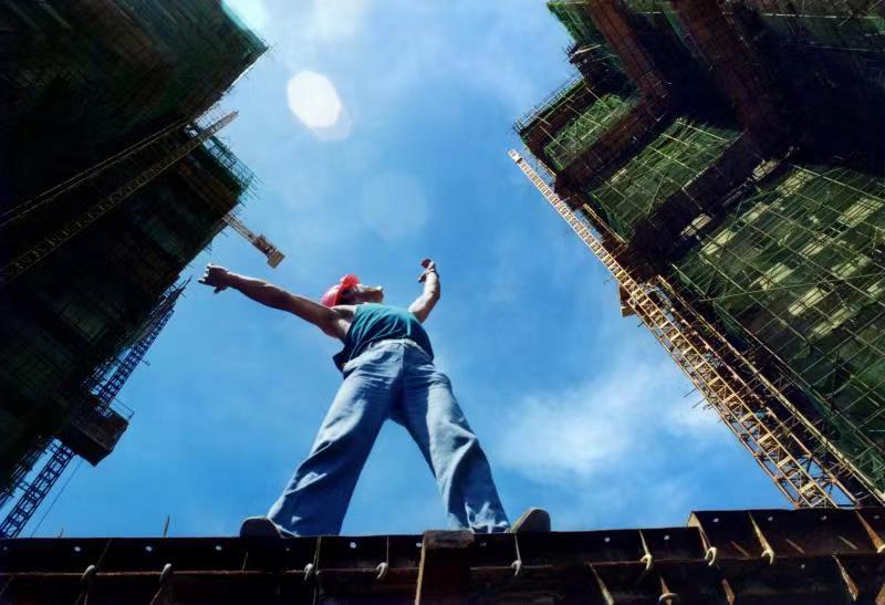 《升》攝於1984年,正是深圳特區的初創年代,反映了基建工程兵建設紅嶺大廈的場景。「大廈非常有氣勢,我找了幾個角度拍攝,但因為沒有人,總覺得少了點生命力。」 這時,大廈上的吊車發出哄隆隆的巨響,周順斌靈光一閃,馬上找到正在指揮塔吊的戰友鄒洪濤,請他配合拍攝。為了凸顯大廈的宏偉和人物的氣勢,周順斌爬上高高的腳手架,在沒有任何安全防護的條件下,他用手腳勾住鐵架,半個身體凌空,以一種高危的姿勢拍下了這一精彩瞬間。