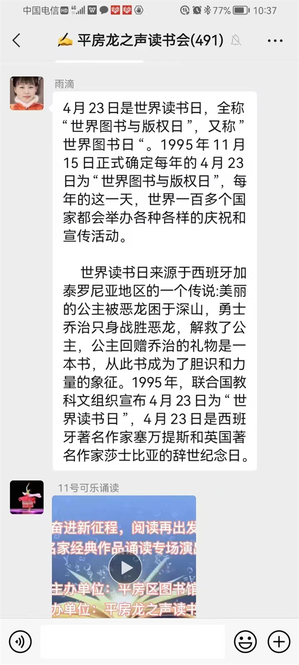 龍之聲讀書會聚集着平房區近500名優秀的創作者、朗誦者、優秀傳統文化傳播志願者。連日來,他們利用微信群平台,發佈原創作品18篇,朗誦優秀作品53件,分享體會102條,進行「口才課」「古詩詞鑑賞課」等輔導講座25次,開展線上綜藝匯演及朗誦專場活動6次。他們因閱讀走到一起,用實實在在的努力為家鄉精神文明建設貢獻力量。