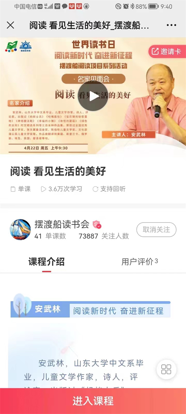 區教育局開展了「閱讀新時代,奮進新征程」線上閱讀教育講座活動。活動邀請了山東大學中文系畢業的安武林老師,為師生們展開閱讀講座。安武林老師是兒童文學作家,詩人,評論家。他的講座聲情並茂,深入人心,受到學生們的歡迎,線上互動熱烈。