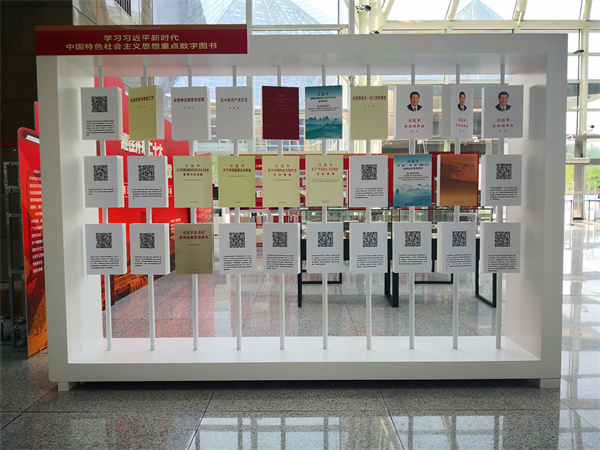除了實體圖書,本次圖書展還設置了一面電子書牆,同步展出學習習近平新時代中國特色社會主義思想重點數字圖書30種,精選習近平總書記的著作集、論述摘編、工作生活經歷、學習讀本及語言典故等數字圖書。讀者現場掃碼即可閱讀,實現實體圖書和電子圖書線下線上聯展,引領讀者深入學習習近平新時代中國特色社會主義思想,弘揚偉大建黨精神。